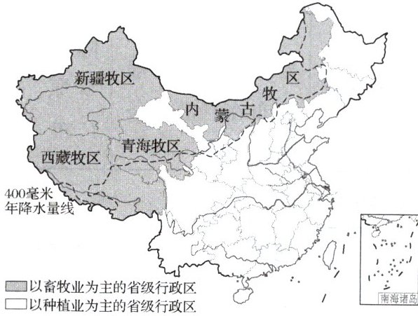 下图为我国主要畜牧区和种植业区分布图。读图,完成1~2题。