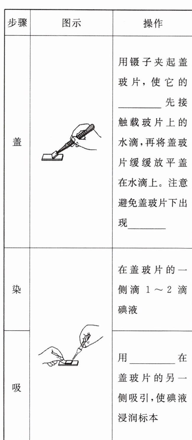 |盖||用镊子夹起盖玻片,使它的______先接触载玻片上的水滴,再将盖玻片缓缓放平盖在水滴上。注意避免盖玻片下出现______|