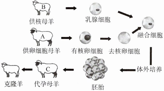 融合细胞 → 体外培养 → 胚胎 → 代孕母羊(C羊)→ 克隆羊
