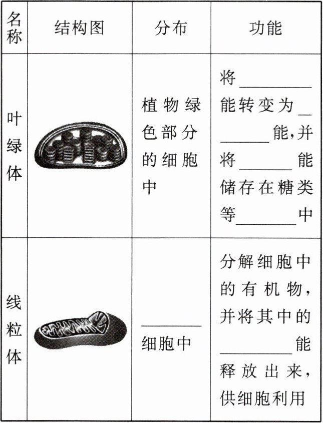 |线粒体|[img]|(空白)细胞中|分解细胞中的有机物,并将其中的(空白)能释放出来,供细胞利用|