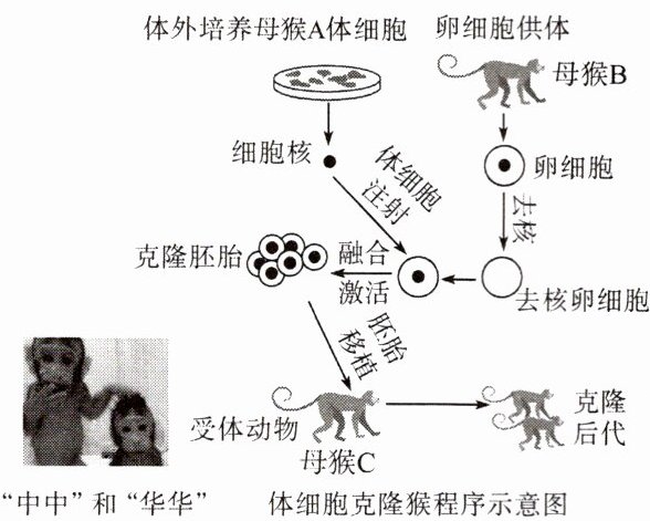 体外培养母猴A体细胞 → 细胞核 → 体细胞注射 → 去核卵细胞(母猴B提供)→ 融合 → 激活 → 胚胎 → 移植 → 受体动物(母猴C)→ 克隆后代(“中中”和“华华”)
