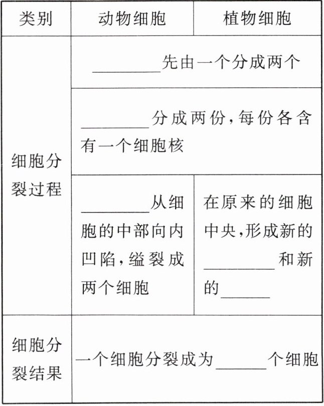 |细胞分裂过程|______先由一个分成两个|______分成两份,每份各含有一个细胞核|______从细胞的中部向内凹陷,缢裂成两个细胞|在原来的细胞中央,形成新的______和新的______|