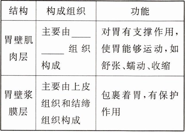 |胃壁肌肉层|主要由____组织构成|对胃有支撑作用,使胃能够运动,如舒张、蠕动、收缩|