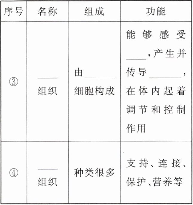 |③|____组织|由____细胞构成|能够感受____,产生并传导____,在体内起着调节和控制作用|