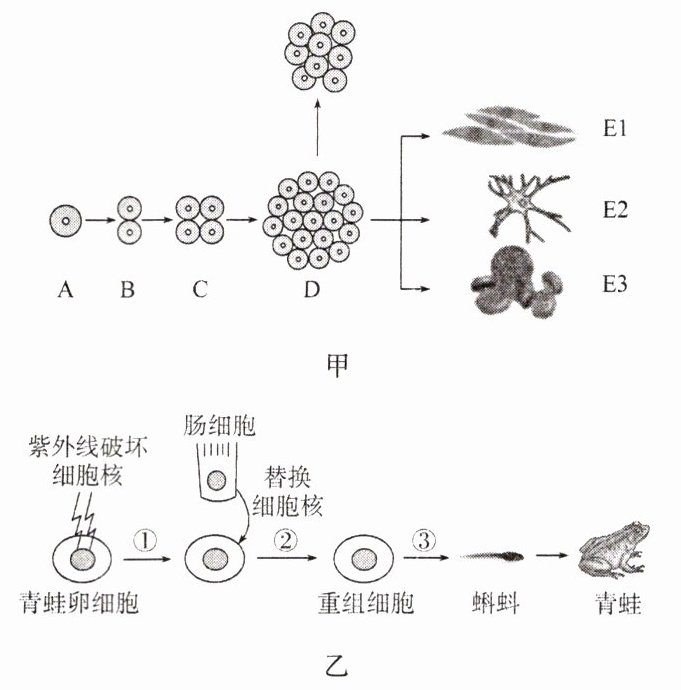 (2) 图甲中从$D→E$表示细胞在形态、结构和功能上发生差异性的变化,该过程是____。其中,由许多肌细胞(E1)联合在一起形成的细胞群叫____。