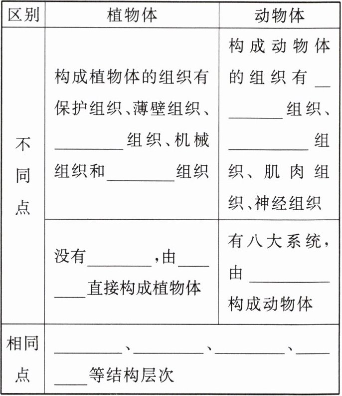 活动2:小盼同学在学习完动物体和植物体的结构层次后,想通过列表的方法对比植物体和动物体在结构层次方面的异同点,请分组讨论并完成下面的表格。