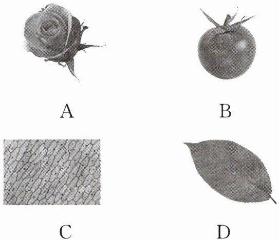 1.C 解析:从构成生物的结构层次上分析,A花、B西红柿和D叶片都是由不同的组织按照一定的次序结合在一起构成的器官。C属于组织。 2.C 解析:黄瓜属于果实;胡萝卜以肉质根作蔬菜食用;土豆是变态茎;菠菜是以绿叶为产品的草本植物,食用部分是叶;大豆是种子。