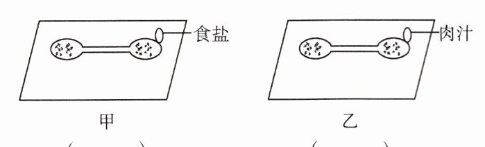 下图中甲、乙表示两块载玻片,从草履虫培养液的表层吸取一些培养液,在上面各滴两滴草履虫培养液,用解剖针在两滴草履虫培养液之间连通一个狭窄的水道,然后在甲载玻片上的培养液的右侧放少许食盐;在乙载玻片上的培养液的右侧滴加少许肉汁,并且在草履虫培养液的液滴上放几丝棉花纤维。