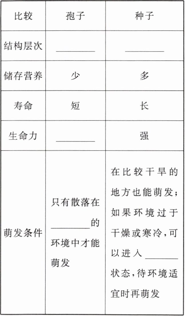 |萌发条件|只有散落在____的环境中才能萌发|在比较干旱的地方也能萌发;如果环境过于干燥或寒冷,可以进入____状态,待环境适宜时再萌发|