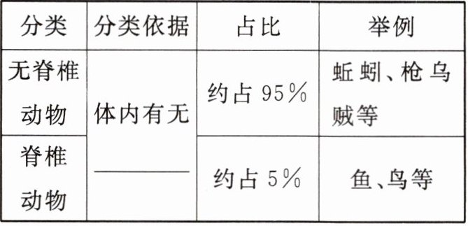 |无脊椎动物|体内有无|约占 95%|蚯蚓、枪乌贼等|