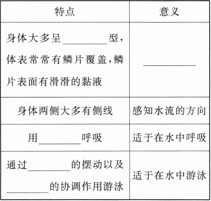 |身体大多呈______型,体表常常有鳞片覆盖,鳞片表面有滑滑的黏液|______|
