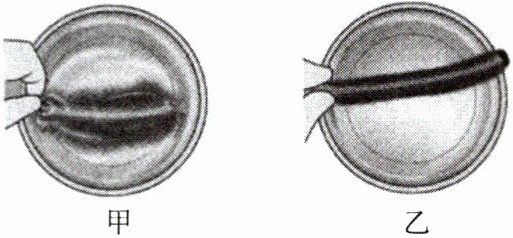 当模型鳃浸在水中时,毛是充分散开的(如图甲所示);但当模型鳃从水中取出时,毛会黏连在一起(如图乙所示)。请结合上面的模拟结果,分组探究,完成以下活动。