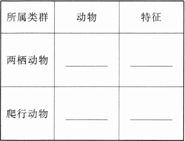 (1)用列表的方法比较一下这两个类群。请将四种动物的代号及其所属类群的特征的序号填入表格。