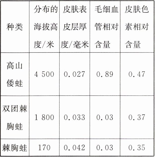 (2)研究人员采集与高山倭蛙亲缘关系较近的分布在不同海拔的蛙类进行相关研究,结果如下表,请根据表中信息回答问题。