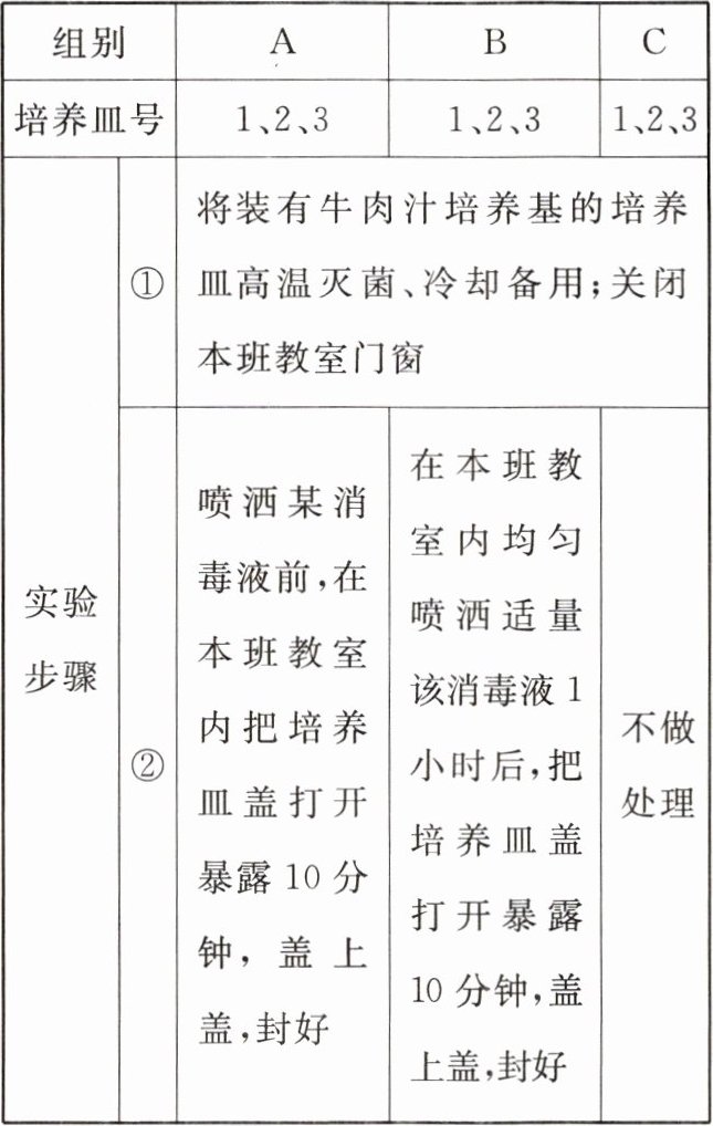 |②|喷洒某消毒液前,在本班教室内把培养皿盖打开暴露10分钟,盖上盖,封好|在本班教室内均匀喷洒适量该消毒液1小时后,把培养皿盖打开暴露10分钟,盖上盖,封好|不做处理|
