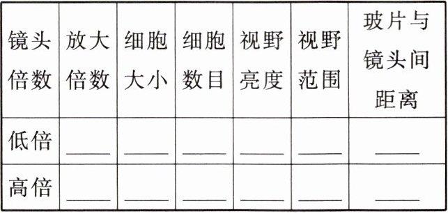 |镜头倍数|放大倍数|细胞大小|细胞数目|视野亮度|视野范围|玻片与镜头间距离|