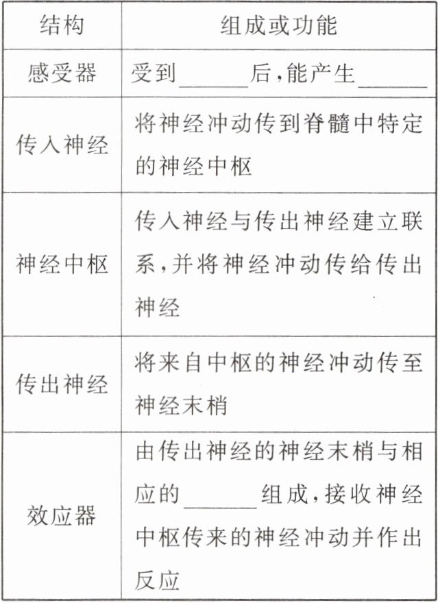 4. 完成下列反射弧各部分的组成或功能表格