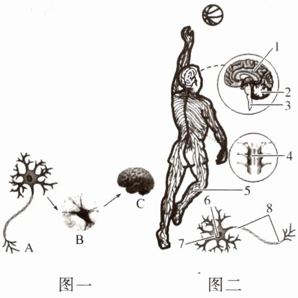 、脊髓和与它们相连的神经组成的。(3)如图二所示,在赛场上,运动员从看到篮筐到准确完成投篮的过程中,对投球角度、力度作出准确判断的结构是[