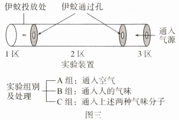 。(4)为了继续探究上述两种气味分子对伊蚊的吸引作用,科研人员又进行了图三所示的三组实验。