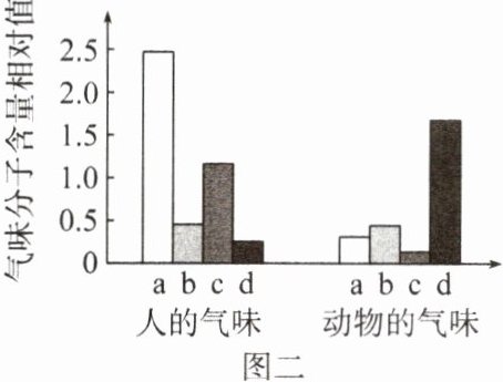 (3)科研人员测定出人和动物中的主要气味分子有a、b、c、d,其含量如图二所示。据图分析,人与吸引伊蚊有关的气味是