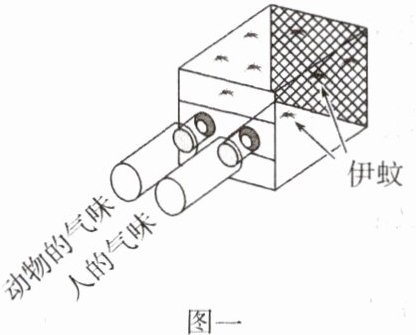 。(2)为探究伊蚊如何区别人和动物,科研人员利用图一所示装置开展实验。几分钟后发现,伊蚊全部趋向人的气味一侧。科研人员作出的假设是