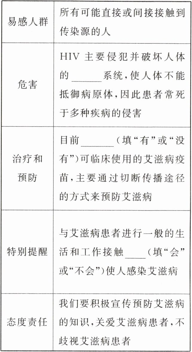 HIV HIV携带者和艾滋病患者的血液、精液(或乳汁)、唾液、泪液和尿液 性接触传播 免疫 没有 不会