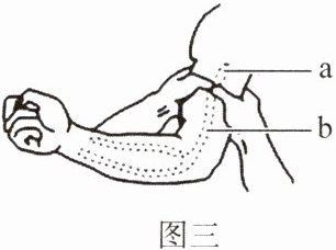 (3)某人外出血时,血液呈鲜红色,从伤口喷出,这是动脉血管出血了。如图三所示,救护者采取指压止血法急救,由此判断伤口在b处,因为动脉出血,是从心脏出发的血液,应在近心端止血。