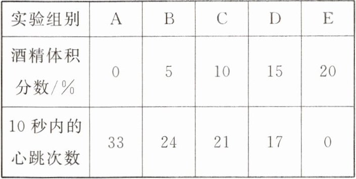 步骤二:将 3 只水蚤分别移入体积分数为 5%的酒精中,观察并记录 10 秒内的心跳次数,取平均值,设为 B 组数据。