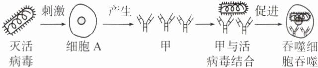 (2)灭活病毒进入人体后引起的免疫过程如图所示。细胞A是什么细胞?它在灭活病毒刺激下产生的甲是什么物质?