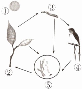 A 解析:食物链中只包含生产者和消费者,不包含分解者和非生物部分,⑤是分解者,所以②→③→⑤不是一条食物链。在生态系统中,能量流动一般是从生产者固定太阳能开始的,所以,生态系统中的能量最终来自太阳。食物链和食物网是生态系统的营养结构,生态系统中的物质和能量就是沿着食物链和食物网流动的。生态系统的组成包括非生物部分和生物部分,非生物部分有阳光、空气、水、温度、土壤(泥沙)等;生物部分包括生产者、消费者、分解者。