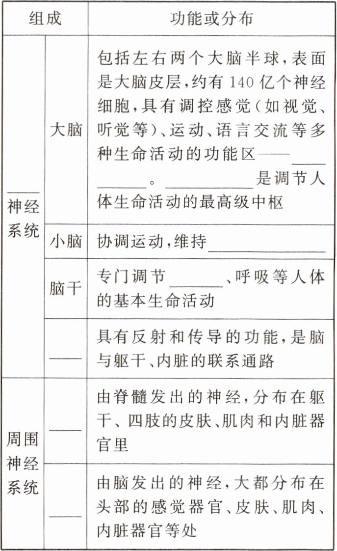 请仔细阅读课本 P12~P14“神经系统的组成”内容,在阅读的过程中,圈画出关键词句。阅读完成后独立思考并试着完成下面的表格。