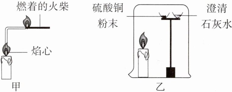 (2)实验乙,在烧杯内靠近顶部的位置放置适量的硫酸铜粉末和澄清石灰水,一段时间后,蜡烛熄灭,得到"蜡烛燃烧的产物中含有二氧化碳"结论所对应的实验现象是 。放置适量的硫酸铜粉末的目的是 。