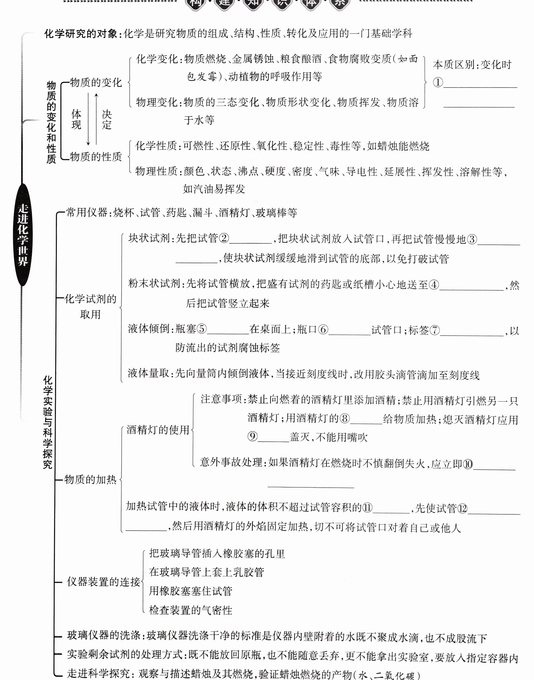 ①有无新物质生成;②横放;③竖立起来;④试管底部;⑤倒放;⑥紧挨着;⑦向着手心;⑧外焰;⑨灯帽;⑩用湿抹布盖灭;⑪三分之一;⑫均匀受热。