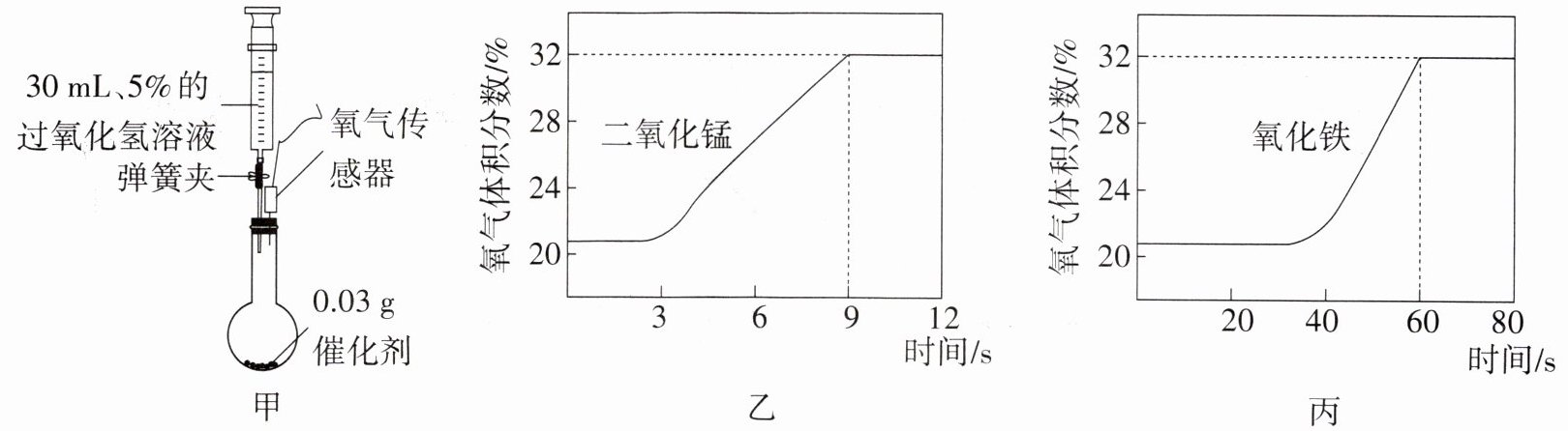 15.催化剂可改变化学反应速率,二氧化锰是常见的催化剂。氯化铁对过氧化氢分解也有催化作用。为比较二氧化锰和氯化铁对过氧化氢分解快慢的不同影响,用如图甲装置进行实验:启动氧气传感器,注入过氧化氢溶液。氧气的体积分数随时间的变化情况如图乙、丙。