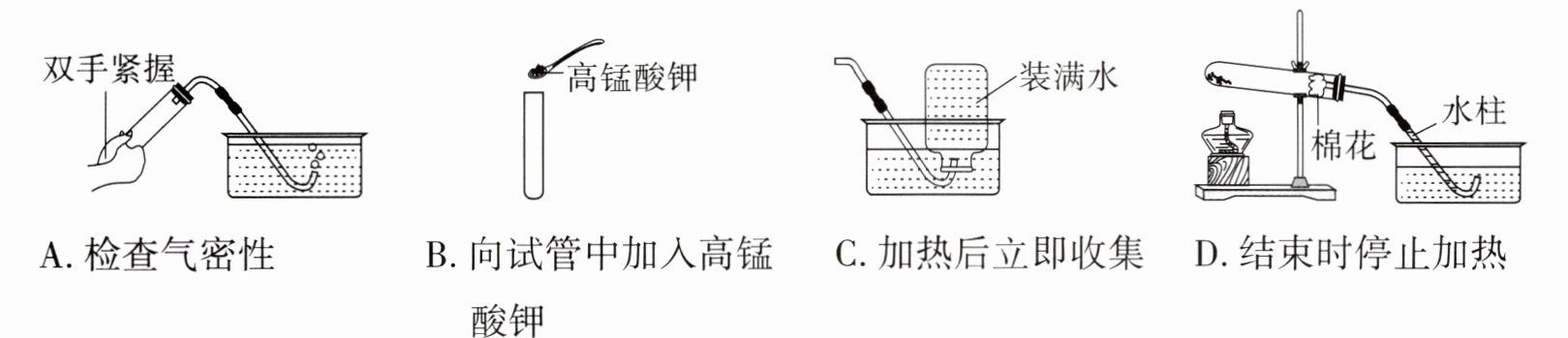 2.实验室用高锰酸钾制取氧气并用排水法收集的操作中,其中一项的操作目的与其他三项不同,该项操作是 ( )