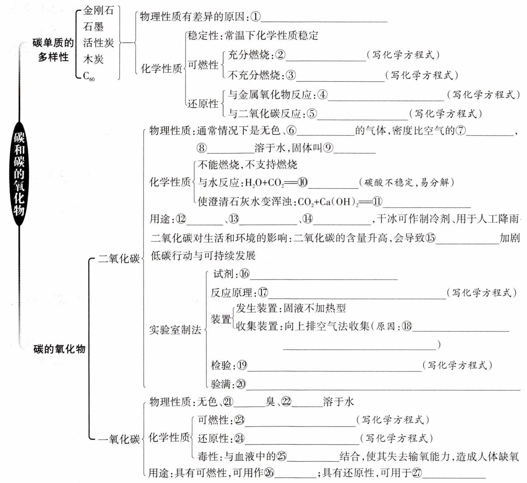①碳原子的排列方式不同;②C + O₂ 点燃 CO₂;③2C + O₂ 点燃 2CO;④C + 2CuO 高温 2Cu + CO₂↑;⑤C + CO₂ 高温 2CO;⑥无味;⑦大;⑧能;⑨干冰;⑩H₂CO₃;⑪CO₂ + Ca(OH)₂ = CaCO₃↓ + H₂O;⑫灭火;⑬作气体肥料;⑭制碳酸饮料;⑮温室效应;⑯大理石(或石灰石)和稀盐酸;⑰CaCO₃ + 2HCl = CaCl₂ + H₂O + CO₂↑;⑱二氧化碳密度比空气大,且能溶于水;⑲CO₂ + Ca(OH)₂ = CaCO₃↓ + H₂O;⑳将燃着的木条放在集气瓶口,若木条熄灭,则已收集满;㉑无;㉒难;㉓2CO + O₂ 点燃 2CO₂;㉔CO + CuO △ Cu + CO₂;㉕血红蛋白;㉖燃料;㉗冶炼金属