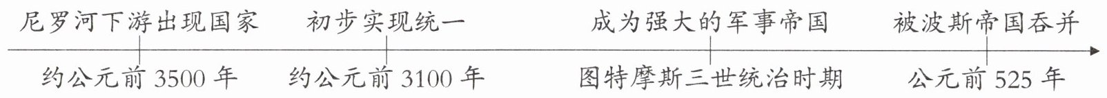 首先,根据年代尺上的信息“尼罗河下游出现国家”“初步实现统一”“成为强大的军事帝国”“被波斯帝国吞并”以及对应的时间“约公元前3500年”“约公元前3100年”“图特摩斯三世统治时期”“公元前525年”,可以判断这个文明古国是古埃及。