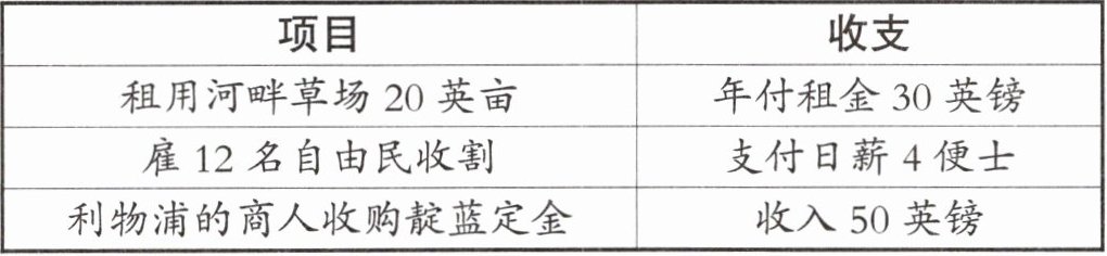 选项B:租地农场主:租地农场主是租地农场的主要经营者,他们租用土地,雇佣自由民进行生产,并将产品推向市场。表格中“老约翰”租用河畔草场20英亩,雇佣12名自由民收割,且有利物浦的商人收购靛蓝定金,符合租地农场主的经营特征,所以B选项正确。
