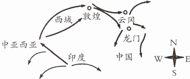 从图片中可以看到路线涉及“西域”“敦煌”“云冈”“龙门”等地点,这些地点与中国古代佛教的传播有着密切关系。佛教起源于古印度,后沿着丝绸之路等路线向东传播,经过西域传入中国内地,在敦煌、云冈、龙门等地都有著名的佛教艺术遗迹,如敦煌莫高窟、云冈石窟、龙门石窟等,这些都是佛教传播的见证。