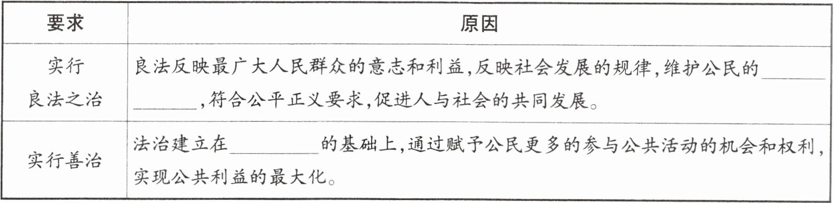 【解析】:本题主要考查法治要求中的良法善治相关知识。对于实行良法之治,需要明确良法所维护的公民权利;对于实行善治,要清楚法治建立的基础。这需要我们对教材中关于法治基础、良法善治的内容有准确的理解和记忆,通过填空的形式来检验对这些知识点的掌握程度。