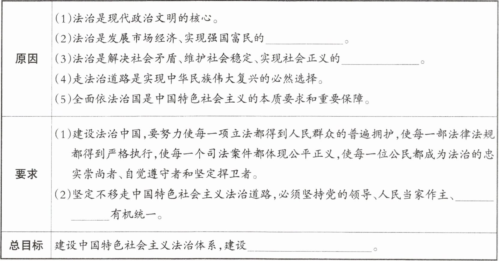 【解析】:本题主要考查全面依法治国的相关知识,包括法治的重要性、建设法治中国的要求以及全面依法治国的总目标等内容。需要准确记忆相关知识点并填写到对应位置。
