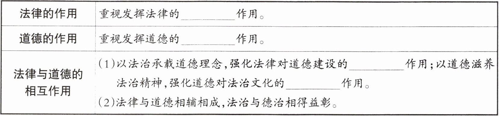 作用。 || 法律与道德的相互作用 | (1)以法治承载道德理念,强化法律对道德建设的