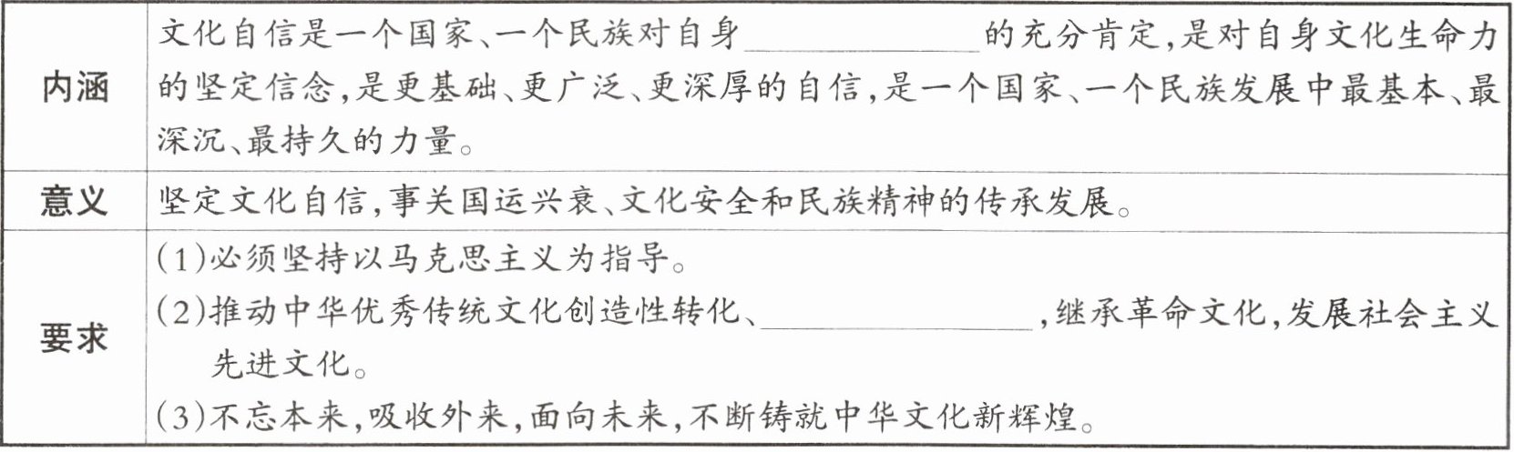 【解析】:本题主要考查文化自信的内涵、意义及要求。文化自信的内涵强调对自身文化价值的肯定和文化生命力的信念。意义部分指出其关乎国运兴衰等。要求部分则明确了以马克思主义为指导,推动中华优秀传统文化创造性转化和创新性发展,继承革命文化,发展社会主义先进文化等。