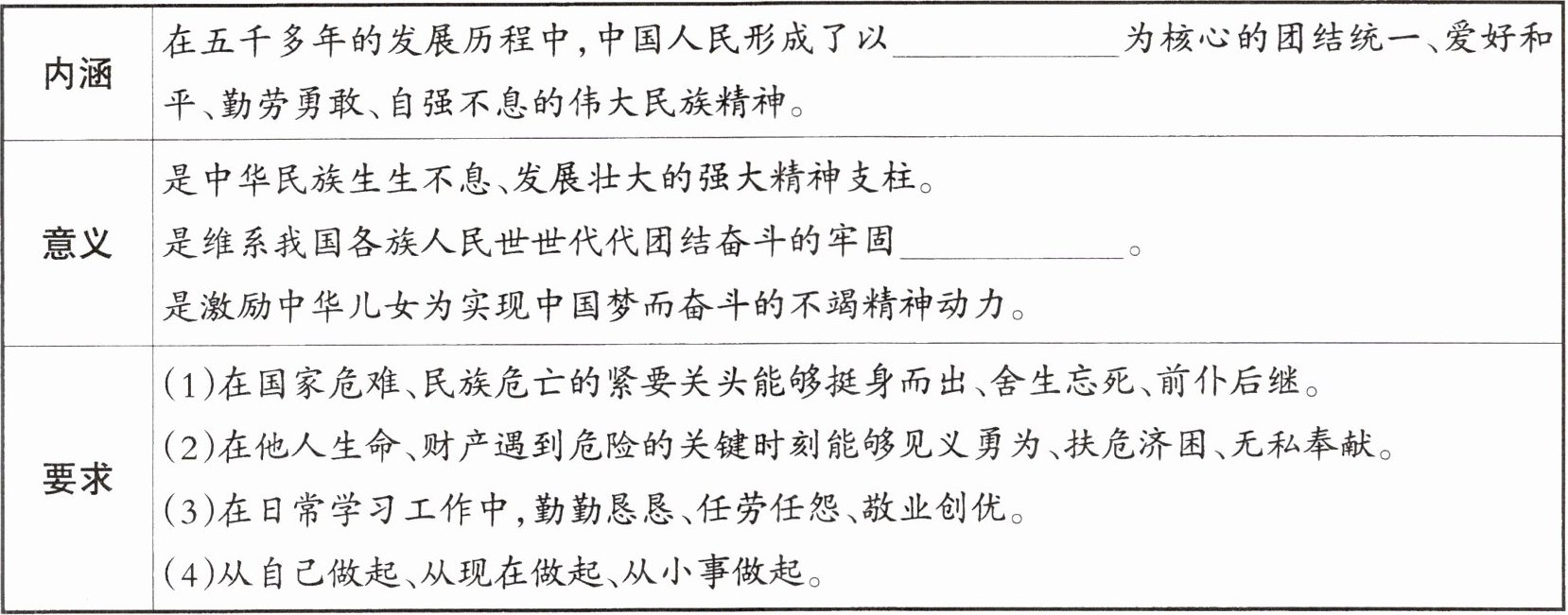 为核心的团结统一、爱好和平、勤劳勇敢、自强不息的伟大民族精神。 || 意义 | 是中华民族生生不息、发展壮大的强大精神支柱。是维系我国各族人民世世代代团结奋斗的牢固