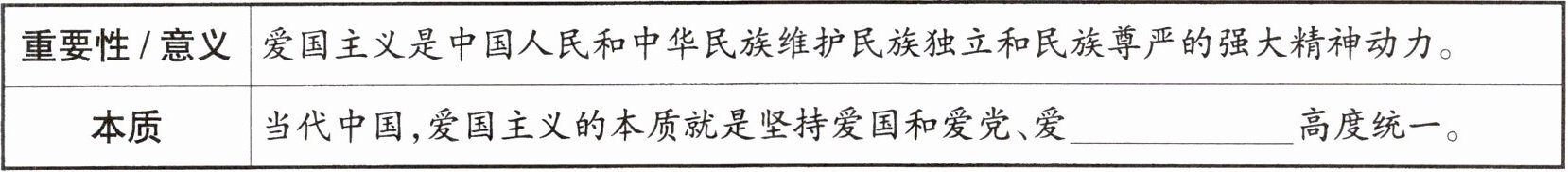 | 重要性 / 意义 | 爱国主义是中国人民和中华民族维护民族独立和民族尊严的强大精神动力。 |