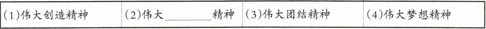【解析】:本题主要考查中国人民具有的四个伟大精神的相关知识。需要准确记忆这四个伟大精神的具体内容,题目给出了伟大创造精神、伟大团结精神、伟大梦想精神,要求填写第二个伟大精神,根据所学知识可知,中国人民具有的四个伟大精神分别是伟大创造精神、伟大奋斗精神、伟大团结精神、伟大梦想精神。