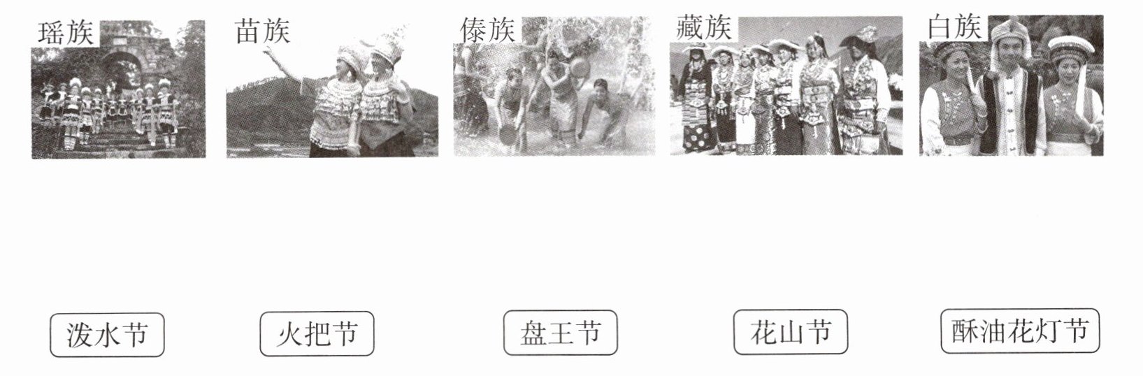 瑶族——盘王节 苗族——花山节 傣族——泼水节 藏族——酥油花灯节 白族——火把节