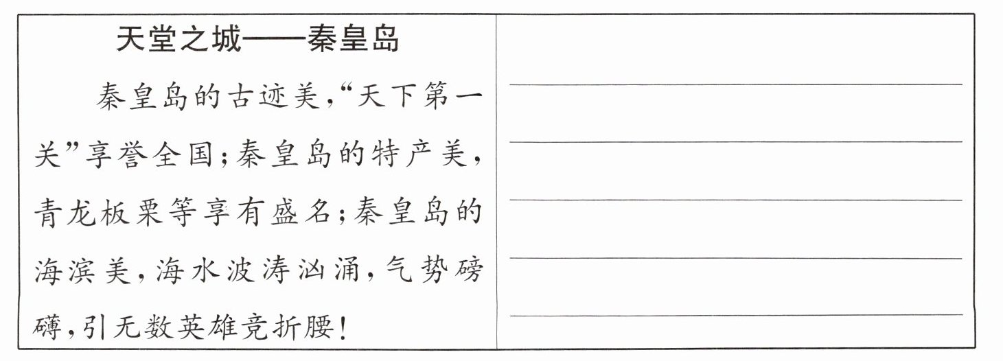 四、班级正在举办以“发现家乡美”为主题的活动,要求每位同学为自己的家乡设计一张名片,请你也来参加。照样子,可以从家乡的风景、特产、名胜、美食等方面设计。