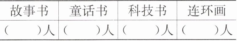 假设经过调查,喜欢读故事书的有$8$人,喜欢读童话书的有$6$人,喜欢读科技书的有$10$人,喜欢读连环画的有$4$人(具体人数根据实际调查情况填写)。
