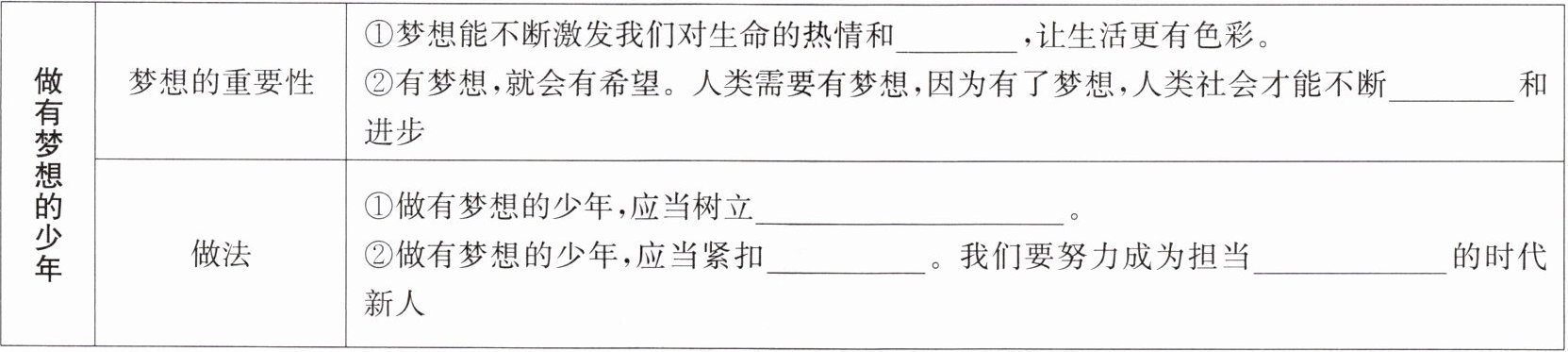 | 做有梦想的少年 | 梦想的重要性 | ①梦想能不断激发我们对生命的热情和____,让生活更有色彩。②有梦想,就会有希望。人类需要有梦想,因为有了梦想,人类社会才能不断____和进步 |